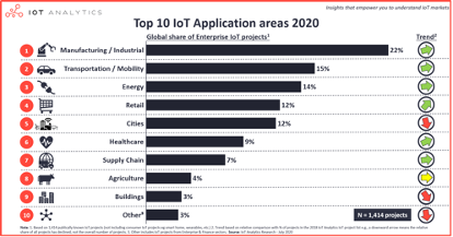 知名物联网研究机构IoT Analytics 2020年的最新报告显示,与往年相比,当前大多数物联网项目仍然落地于工业/制造业领域,另外,交通、能源、零售及医疗保健等垂直领域的市场份额也相对增加。