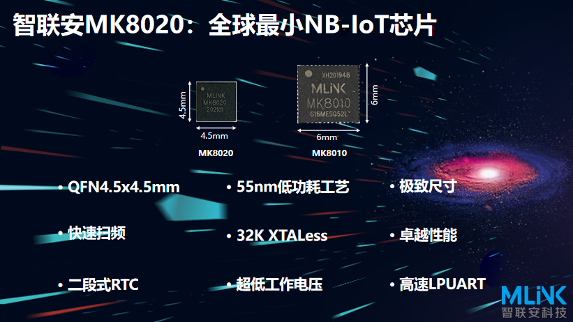 据了解,智联安科技MK8020芯片相比市面上已推出的成熟工艺的NB-IoT芯片面积更小、应用更广、成本更低。MK8010拥有6mm✖6mm的尺寸,与市场已发布的产品大小相当。而MK8020的尺寸仅为4.5mm✖4.5mm,面积仅有第一代产品的一半,可以激活因体积限制而无法应用的更多场景。