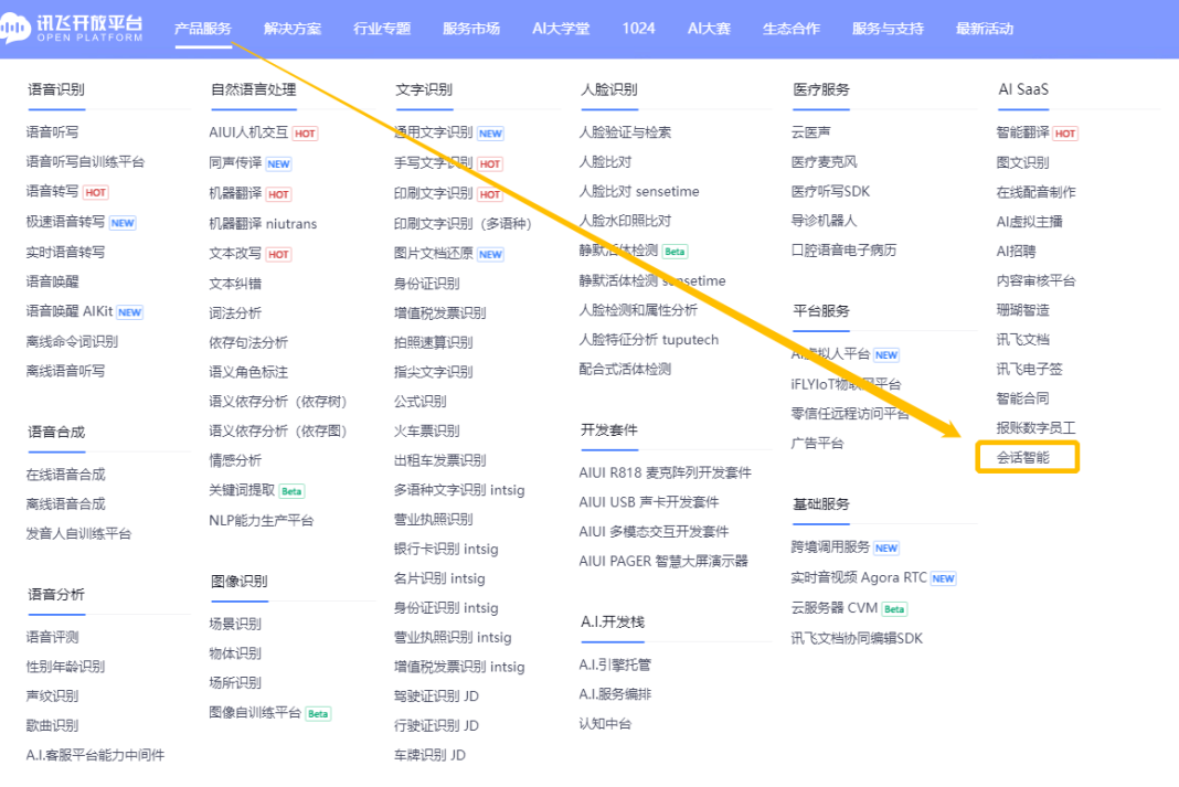 第一步:PC端打开会话智能官网 http://icase.xfyun.cn/;或打开讯飞开放平台 https://www.xfyun.cn/,点击“产品服务-会话智能”,进入官方网站。