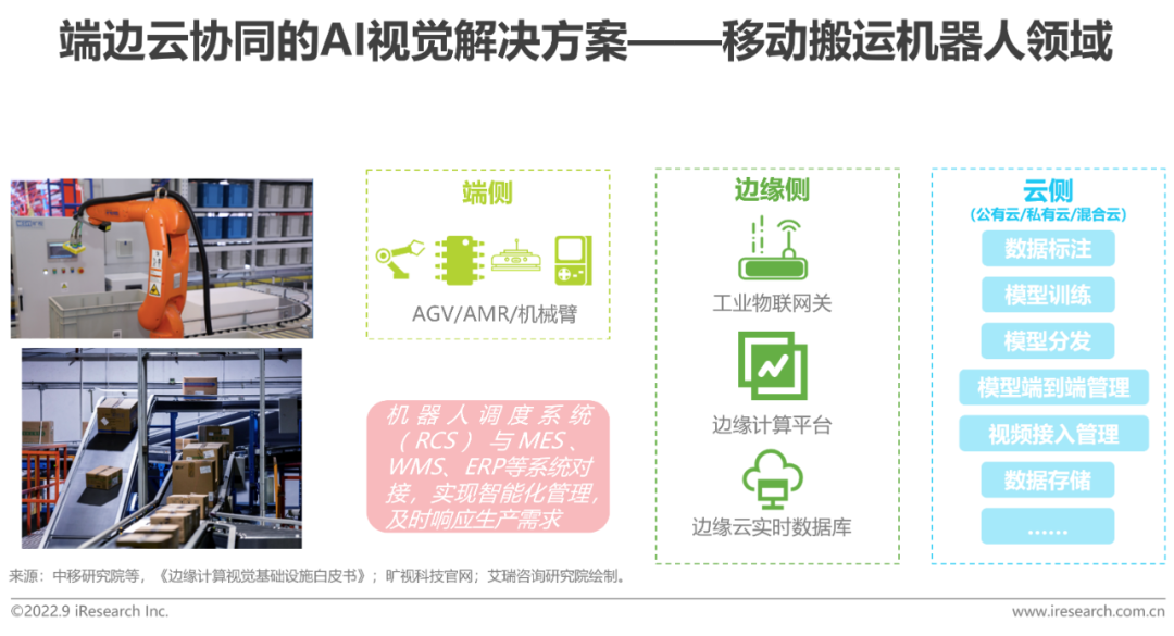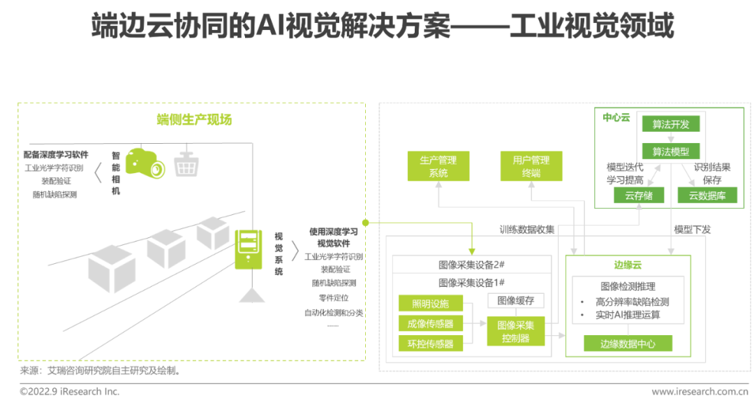 AI视觉在检测方面由于适宜处理易混淆的问题、能够直接判别缺陷如何处理,覆盖了传统工业机器视觉的功能盲区,尤其在3D尺寸及缺陷监测任务中表现出明显优势;且通过3D视觉传感器等,可使工业相机具备深度学习检测能力,无需再配备工业计算机,具有更高效率、开发简易、硬件投资节约等优点。基于以上优势,AI视觉可以完成工业智能运维中的外观异常检测、仪表示数异常检测,帮助实现预测性维护和智能运维;也可以独立应用于生产环节的质量质检、产品和组件装配检查等。具体部署层面,AI视觉技术可与激光设备、图像读码器等现场工业装备或工业相机、镜头等机器视觉系统集成应用,亦可通过工业互联网平台实现端边云一体化应用。端边云协同部署方案可以有效实现在线获取数据、在线调试,快速实现模型的迭代优化、实时下发至端侧实时应用,提升运维人员的AI模型迭代效率的同时保证低时延、缓解通信链路带宽压力等要求。