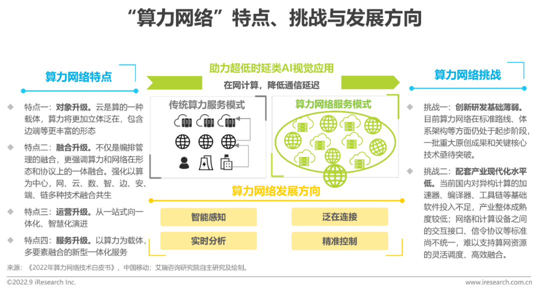 端边云协同的AI视觉应用对算力和网络部署提出了要求。传统的算力和网络相互独立,二者仅为简单的连接关系。而以NFV/SDN为核心技术的下一代网络规模部署,算力和网络开始在基础设施层面逐步融合,算力资源融入通信网络。随着5G+边缘计算的飞速发展,进一步驱动网络开始感知算力位置,实现就近分流。未来,算网将在协议和形态层面进一步融合,通过在网络协议中引入算力信息,将应用请求沿最优路径调度至算力节点;网络设备通过共享自身算力,对数据进行在网计算,降低通信延迟,具备低时延和按需使用的特征,将推动车联网自动驾驶、超边缘生产现场、公共安全、XR文娱等超低时延类AI视觉任务的应用推广。