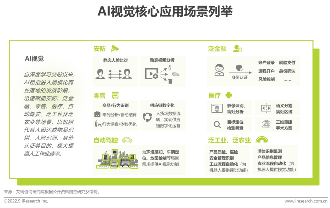 AI视觉主要以图像和视频等高维、密集数据为主要处理对象,深度提取信息,在安防行业首先实现规模化落地,用于进行人员数据的静态查询与动态比对,以及监控视频内容的结构化处理;金融行业更多通过人脸识别的身份验证保证操作行为的安全合规。此外,AI视觉还逐步赋能于零售、医疗、自动驾驶、泛工业、泛农业等领域,应用场景广泛,商业价值不断被挖掘。