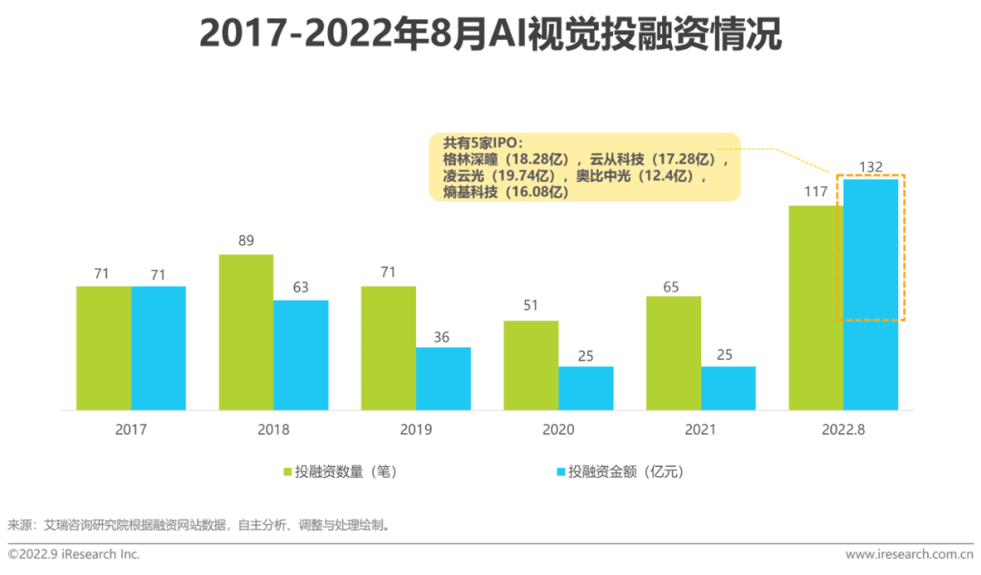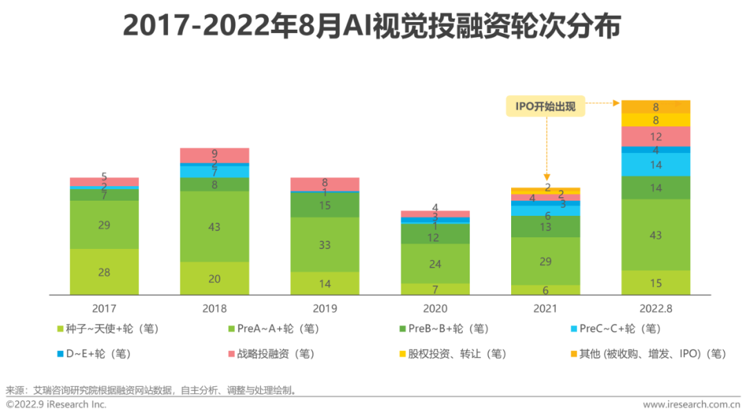 创业企业是AI视觉市场的主要参与力量之一。行业在经历了三年的投融资低迷期后,2022年投融资数量和金额皆创历史新高。截至2022年8月,我国AI视觉相关业务获投企业数量已达292家,近半数属于2020年10月以后的新增企业。投资热潮全面复苏,科创板顺利落地为AI行业引入了中长期资金通道和市场关注度,加速推动一批拥有核心技术的厂商成长。从2021年开始,AI视觉领域的股权投资、转让、被收购、IPO事件数量开始增加。2022年云从科技,熵基科技等生物识别厂商集中上市表示AI视觉的行业成熟度和认可度已进入新阶段。
