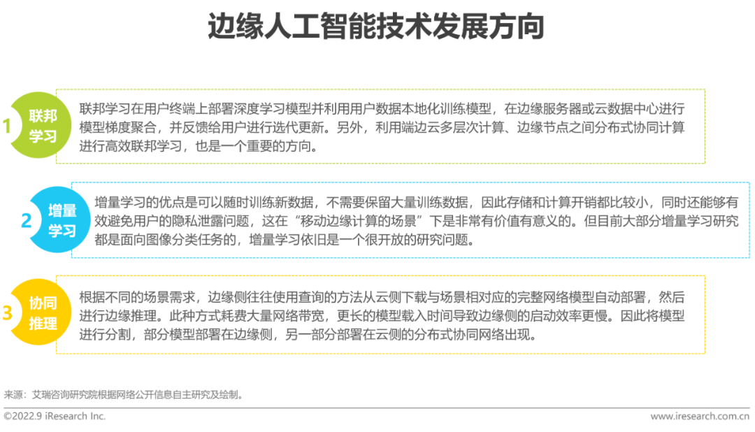 在端边云协同的AI视觉解决方案部署架构中,由于多端侧场景下的训练数据通常以分布式形式产生和存储在不同终端设备中。因此如何以较低的网络成本、强收敛性、高安全性来进行AI模型的分布式训练就非常关键。目前,面向边缘智能的模型训练优化技术主要包括联邦学习、增量学习、协同推理等方向。此外,边缘AI技术目前多集中在深度学习的图像分类领域作为切入点,但在更多的AI视觉领域如目标检测、属性分析、关键点检测、行为分析、运动状态、重识别等研究较少,上述技术领域发展未来具有更高的商业应用价值。