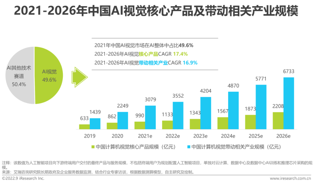AI视觉产业背景:AI视觉又称计算机视觉,得益于深度学习技术的快速发展,已于安防、金融、制造、零售等多领域实现规模化商用。2022年,AI视觉相关投融资热潮全面复苏,通用技术、工业与零售赛道热度高企,持续受到资本青睐。2021年我国AI视觉产品的市场规模占整个人工智能行业的49.6%,达到990亿元。从资本热度、市场规模、场景泛用、带动作用来说,AI视觉已成为AI产业发展的主战场,未来增量动力依然强劲。