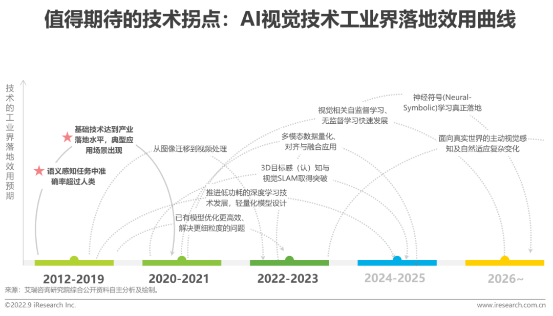 自2012年采用深度学习架构的AlexNet模型以超越第二名10个百分点的成绩在ImageNet竞赛中夺冠。得益于深度学习所需专家分析和微调较少、能够处理海量数据、具备高灵活性等优势,深度学习技术在目标检测、目标跟踪、图像分割、场景分类、字符识别、人脸识别、姿态估计、动作与行为识别等方向上陆续取得了多项突破性成果。AI视觉在工业界逐步实现商用价值,步入规模化商业落地阶段。同时,随着相关设备能力的改善(如算力、内存容量、能耗、图像传感器分辨率和光学器件),提升了视觉应用的性能和成本效益,进一步加快了AI视觉商业应用的扩展。