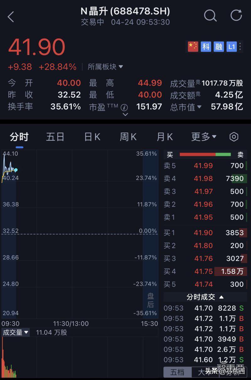 其发行价为32.52元/股,发行市盈率达129.9倍,开盘涨23%至40.00元/股,截至09点53分,股价最高涨至44.99元/股,涨幅达38%,市值近58亿元。