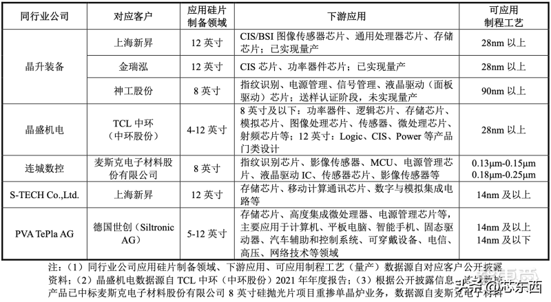 晶升股份半导体级单晶硅炉完整覆盖主流12英寸、8英寸轻掺、重掺硅片制备,生长晶体制备硅片可实现28nm以上CIS/BSI图像传感器芯片、通用处理器芯片、存储芯片,以及90nm以上指纹识别、电源管理、信号管理、液晶驱动芯片等半导体器件制造,28nm以上制程工艺已实现量产。