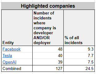 在这些事故中,Facebook、特斯拉、OpenAI 造成的 AI 事故占据目前所有已知事故的前三名,占比分别为 9.3%、7.7%、7.5%。