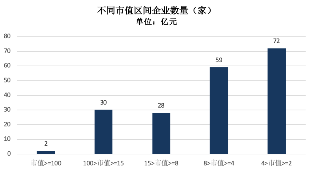 根据统计,大部分符合上市条件的物联网企业市值,位于2亿元到4亿元之间,共有72家。位于4亿元到8亿元区间的有59家。市值超过100亿元的有两家。