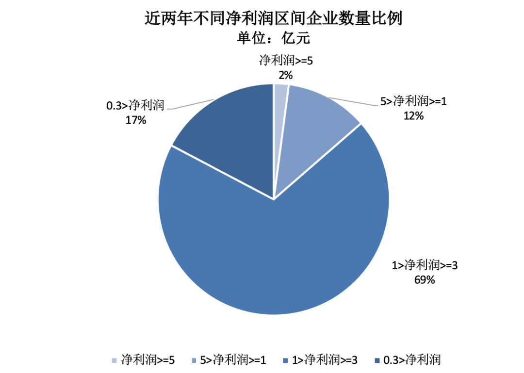 从财务数据表现上看,超过半数(占比为56%)的物联网企业近两年营收在2亿到10亿元之间。而在盈利能力上,将近7成的物联网企业近两年净利润在3000万到1亿元之间。