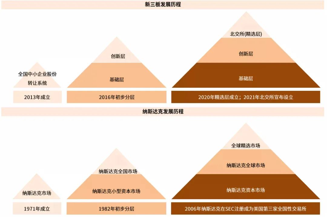 任何一个市场都有特定的历史背景和制度环境下的发展路径,虽然不能简单用纳斯达克与北交所类比,但依然可以借鉴其发展经验,判断北交所的定位、特征和作用。
