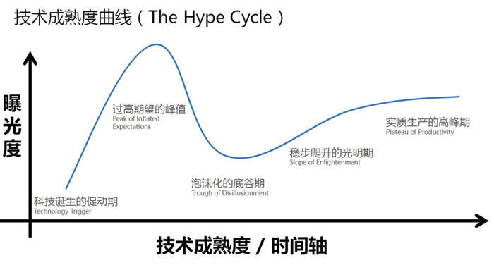 在日前由《财富》举行的活动中,威沙尔·夏引用了科技圈常用的一个术语Hype cycle(技术成熟度曲线)。其中,这个词汇主要描述了一项技术从诞生到成熟的一般过程。相关曲线表明,每项技术的发展过程基本可分为五个阶段:上升期、快速发展期、下降期、爬坡期和稳定应用期。