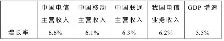 中国电信、中国移动、中国联通的通信服务收入分别达到2359.77亿元、4522亿元和1710.4亿元,同比分别增长6.6%、6.1%和6.3%,收入增长均高于同期5.5%的GDP增速。