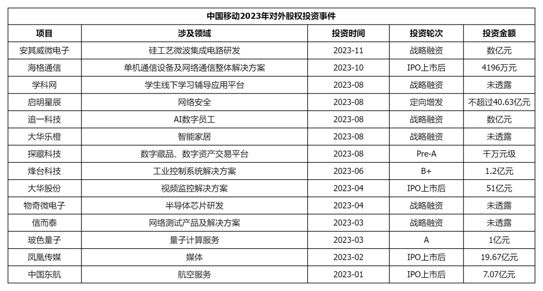 中国移动2023年的股权投资事件可谓鲜明体现了相关目标和思路。