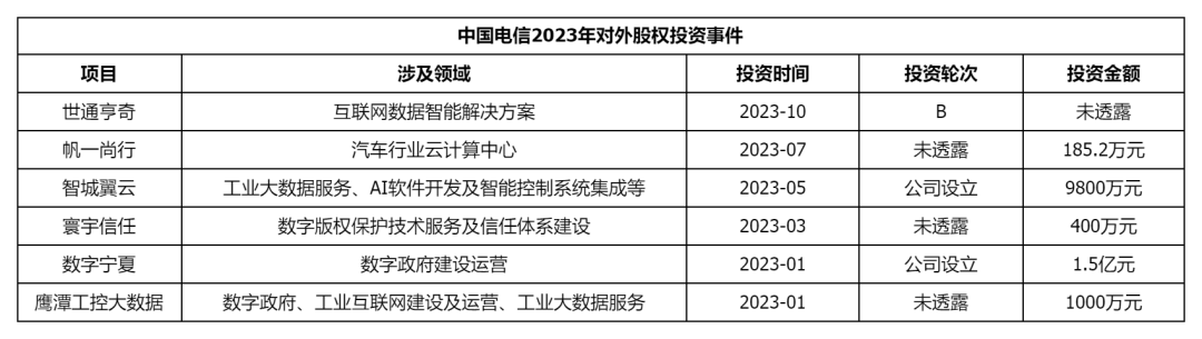 据不完全统计,中国电信2023年发生了6项对外股权投资事件,涉及领域涵盖工业大数据服务、云计算、AI、智控系统、数字政府、数字版权保护等。总的来看,相关项目多与大数据、云计算等高度相关。其中,涉及工业大数据服务、AI、智控系统的项目有2个,投资金额1.08亿元;涉及数字政府建设运营的项目2个,且金额最大,达到1.6亿元。