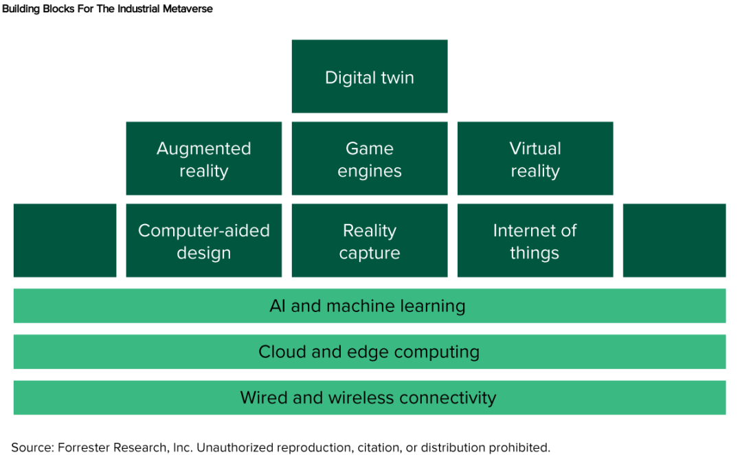 市场研究机构Forrester Research曾经分析认为,工业元宇宙是一个高度复杂的系统工程,需要数字孪生、虚拟现实、机器人、自动驾驶、5G通信、云计算、大数据分析、人工智能、区块链以及计算机图形学等多项前沿技术的深度融合,才能共同构建起连接数字世界与真实世界的庞大基础设施。