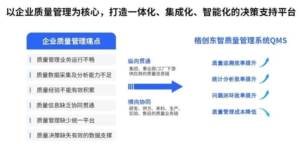 相比之下,QMS的核心优势在于:面向集团、产品,实现全生命周期质量管理,通过数据采集与录入,将原本离散、隐性的质量数据进行深度挖掘与汇总分析,为产品全生命周期的质量管控提供有效的数据支撑。纵向上,贯通了集团、分子公司、事业部、工厂的质量信息链;横向上,协同研发设计、采购、来料、生产、实验、售后的质量业务链。从而构建起以质量管理为核心、一体化、集成化、智能化的策划、控制和决策支持平台,实现质量工作网络化、协同质量事件有效闭环、质量信息智能应用、质量经验充分共享,全面提升质量管控能力。