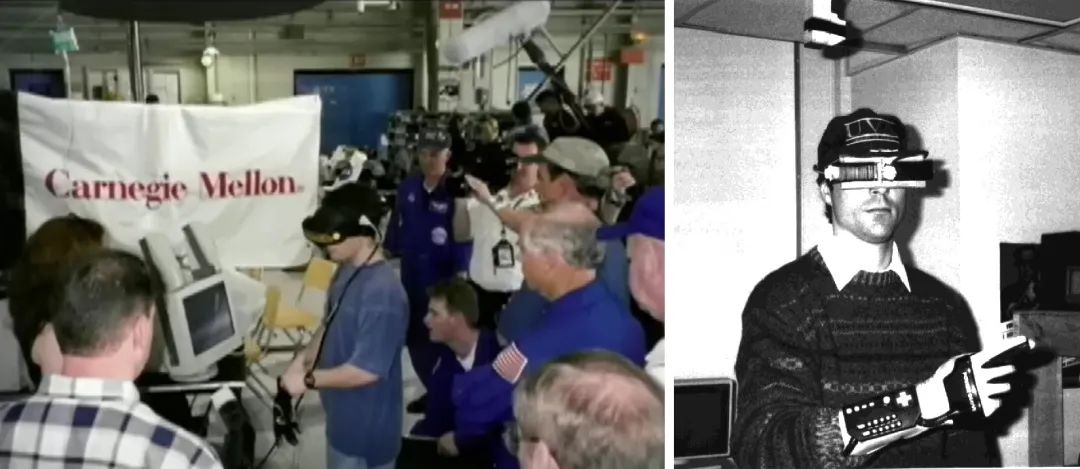 左图为教授带领学生参加比赛使用头显;右图为1991年教授团队进行头显尝试