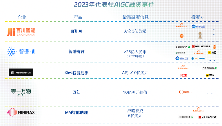 去年,国内AIGC圈内一共至少包含5起代表性融资事件,其中智谱AI凭借智谱清言一年共获得了超过25亿元人民币融资,月之暗面的Kimi智能助手更是在A轮就吸引了超过10亿美元。