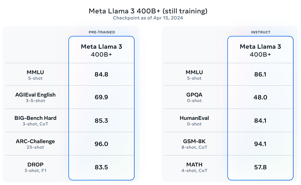 ▲Meta研究团队在4月15日评估了预训练和Instruct版中经过部分训练的模型,并报告了性能数据