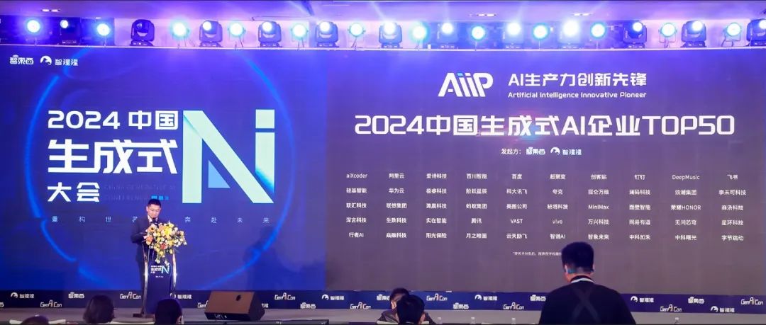还有多个“行业首发”:会上,2024「AI生产力创新先锋(AiiP)-中国生成式AI企业TOP50」正式揭晓,李未可科技发布面向眼镜等未来终端定向优化的自研WAKE-AI多模态大模型,58同城宣布其大语言模型平台今晚将上线Llama 3。