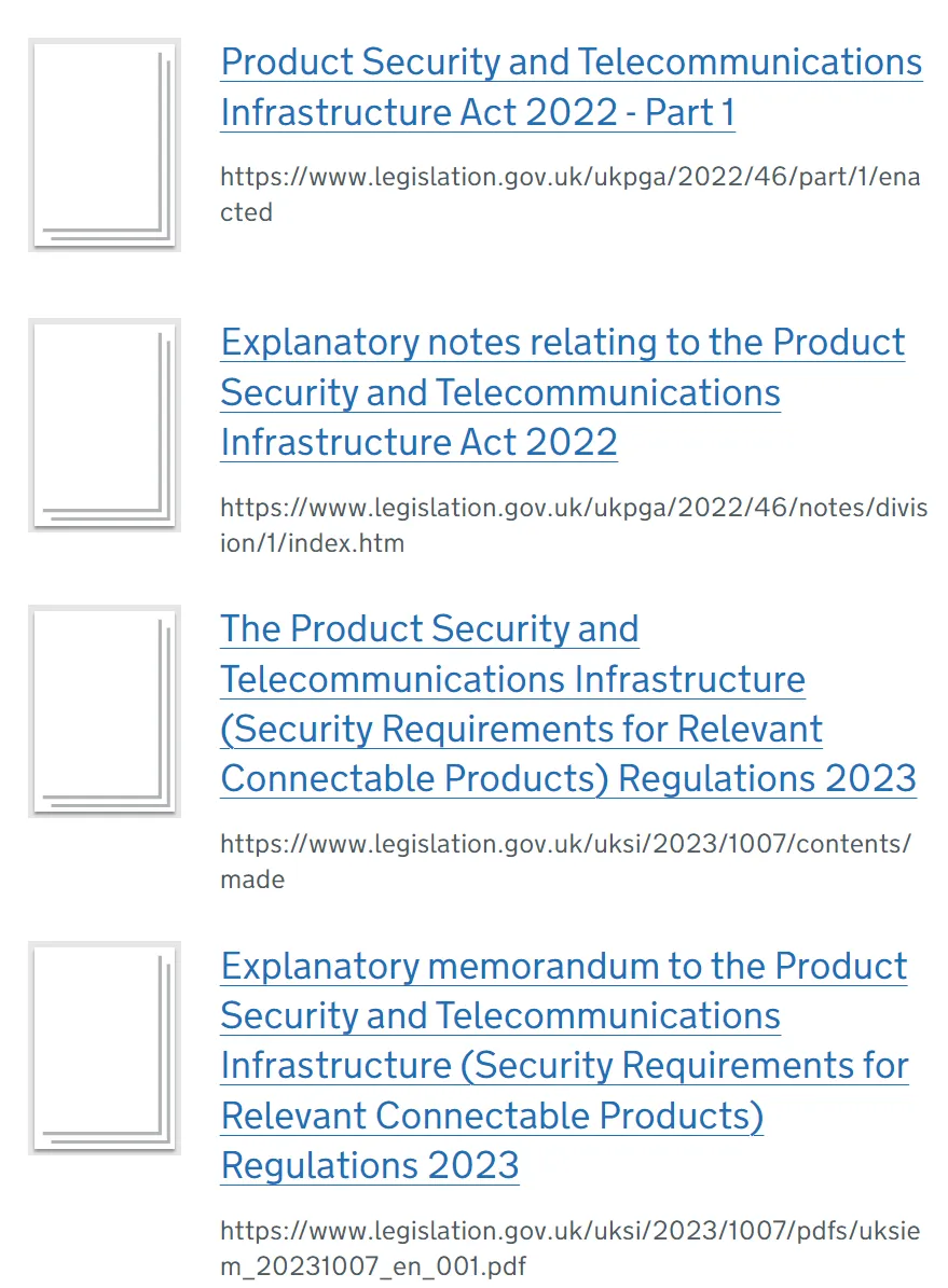 PSTI 法案于 2022 年 12 月获得批准。政府于 2023 年 4 月发布了 PSTI(相关互联产品的安全要求)法规的完整草案。这些法规于 2023 年 9 月 14 日签署成为法律。