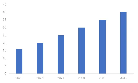 2023-2033全球物联网连接数(单位:十亿,来源:Transforma Insights)