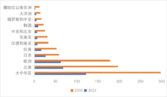 Transforma Insights也对物联网也对物联网带来的连接、模组和服务的价值进行统计和预测。总体来看,全球物联网连接、模组和服务市场规模约为3340亿美元,到2033年这一数字将达到9340亿美元。不同区域市场规模差距很大,Transforma Insights分别对其进行统计和预测。
