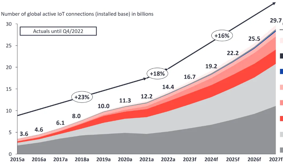 根据Transforma Insights的跟踪数据,截至2023年末,物联网连接数超过160亿,这与多家市场研究机构的数据基本一致。例如,IoT Analytics的跟踪数据显示到2023年底物联网连接数将达到167亿。