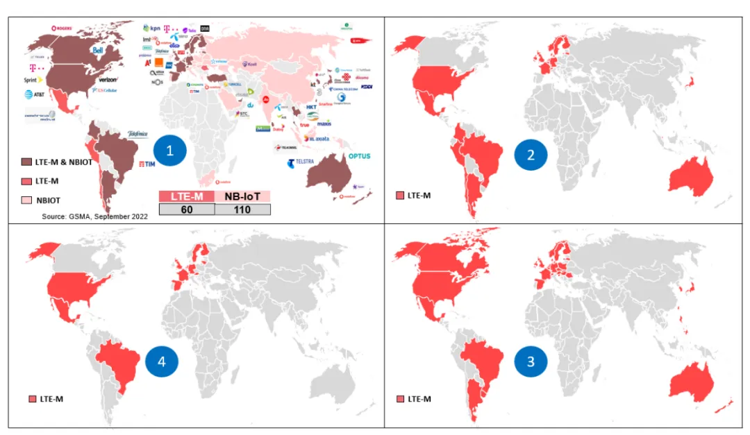 如下图1所示,这是 GSMA 追踪的全球 LTE-M 和 NB-IoT 部署情况:NB-IoT 由 110 家运营商在大约 60 个国家部署;LTE-M 由 60 家运营商在 34 个国家实现商业化——这两种技术在欧洲、北美和澳大利亚的大部分地区以及亚洲部分地区都是可用的。