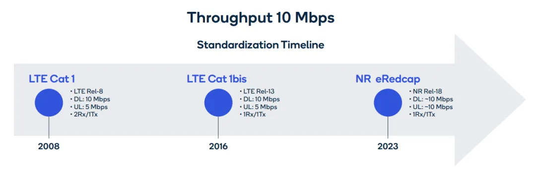 在 2023 年底之前,3GPP 将冻结 Rel-18 标准,其中包括 NR eRedCap。eRedCap 专为资源受限的物联网设备设计。NR eRedCap 将扩展支持最高 20 MHz 的类似信道带宽,并使用与 Cat 1bis 相同的单天线架构提供约 10 Mbps的数据速率。这为需要简单射频设计和 Cat 1 类似数据速率的应用提供了明确的连续路径。当 eRedCap 设备推出时,LTE 将成为它们的备用技术,从而使其能够在 LTE 上以 Cat 1bis 模式运行。