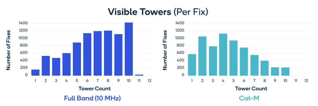 下图显示了在 10 MHz 信道上运行的 LTE Cat 1 设备检测到的小区站点(左图)与 Cat-M 设备检测到的小区站点(右图)的数量。有了对更高信道带宽的支持,Cat 1 设备可以相当一致地检测到 5 到 10 个小区站点,从而提高了定位精度。