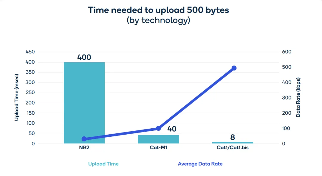 如图所示,要在 NB-IoT 和 LTE-M 上上传或接收 500 字节的数据,设备的 ON 时间分别为 400 毫秒和 40 毫秒;相比之下,Cat 1bis 设备可以在 8 毫秒内完成相同的数据交易(吞吐量=500 Kbps)。