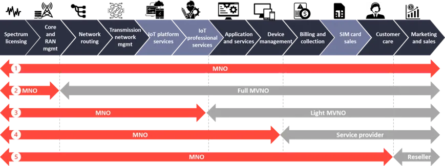 蜂窝物联网连接主要由2类供应商来提供,即移动运营商(MNO)和移动虚拟网络运营商(MVNO),这两种类型的运营商直接向终端用户提供蜂窝物联网连接服务,最终瓜分近36亿的连接市场。其中,MNO拥有物理的、基于许可的网络基础设施,并基于该基础设施提供服务,而MVNO则是利用MNO的许可和能力来提供自己的服务,因此,MVNO物联网连接服务的收入有助于MNO的收入。