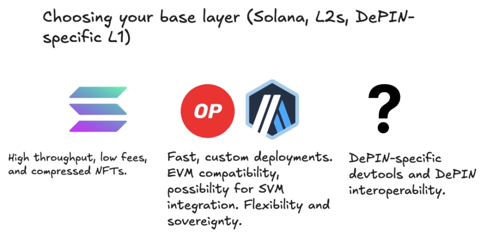 DePIN的基础层选择一直是一个备受争议的话题。无论最终选择何种方案,都需要在各方面进行权衡。就像其他类型的网络一样,DePIN也有两个主要关注点:需求侧和供应侧。毋庸置疑,需求侧通常更难得到验证。