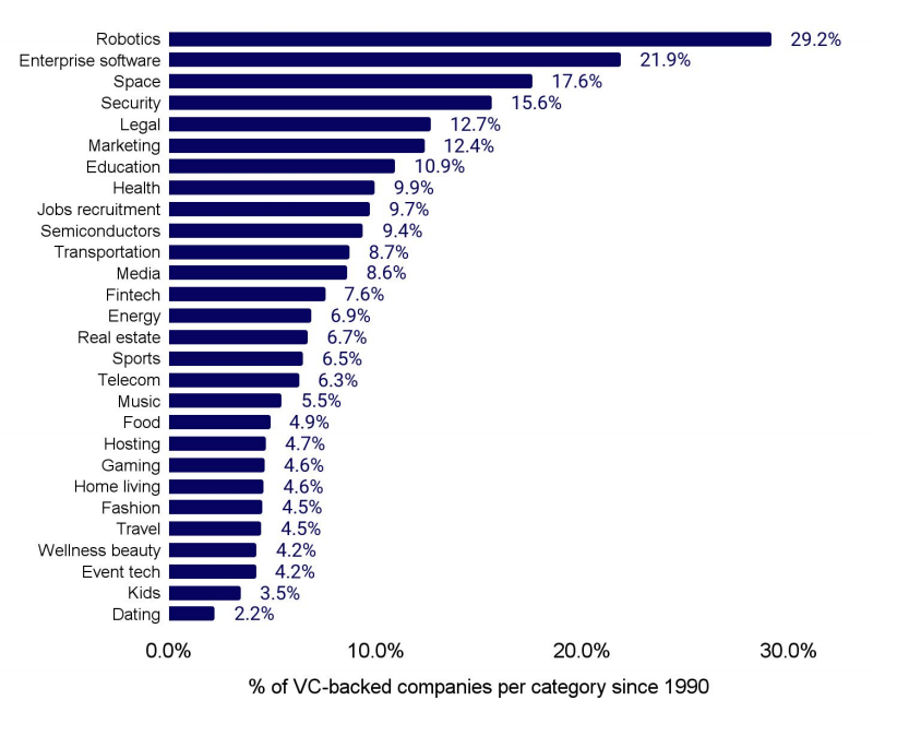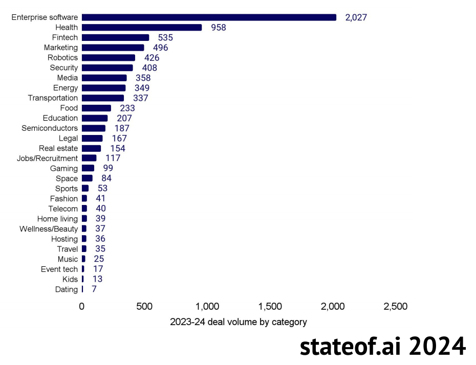 在所有风险投资支持的公司中,AI公司的比例在机器人、企业软件、航空航天和安全领域最高。去年,企业软件、医疗、金融和营销是资金最活跃的AI类别。