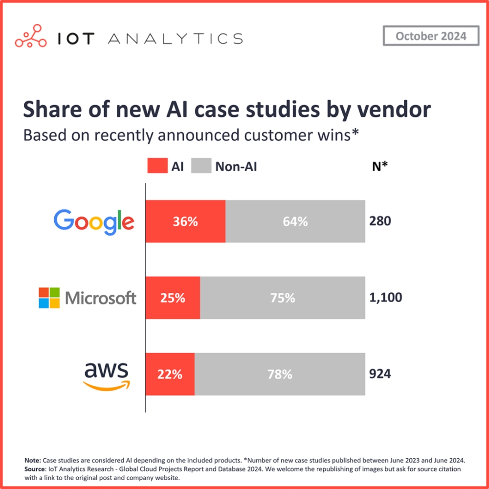 值得一提的是,在传统AI案例(不包含GenAI)数量上,AWS以176个案例领跑。同时,相比整体新增云案例,谷歌在AI领域的占比最高,达36%。