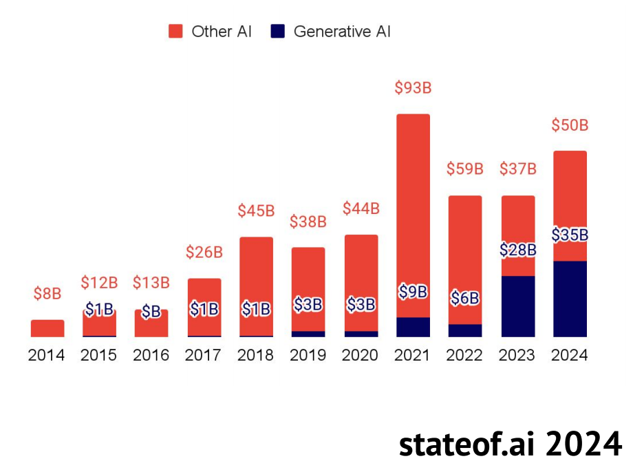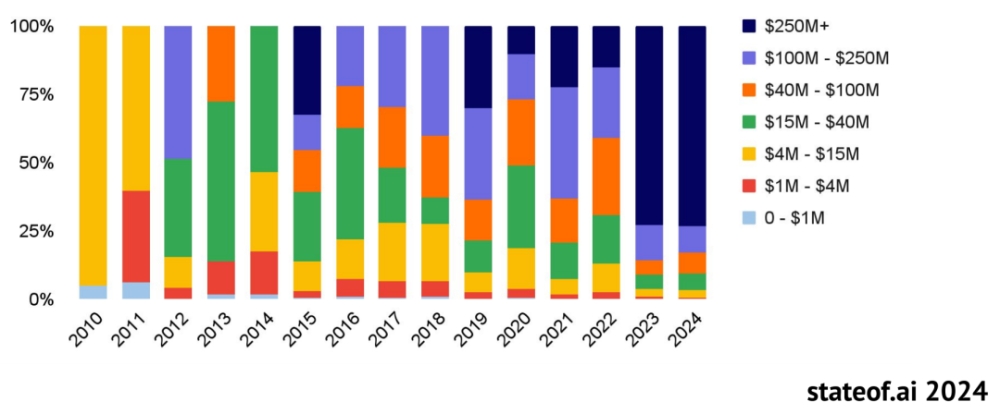 在过去两年中,2.5亿美元以上的超大轮融资主导了AI领域的融资。