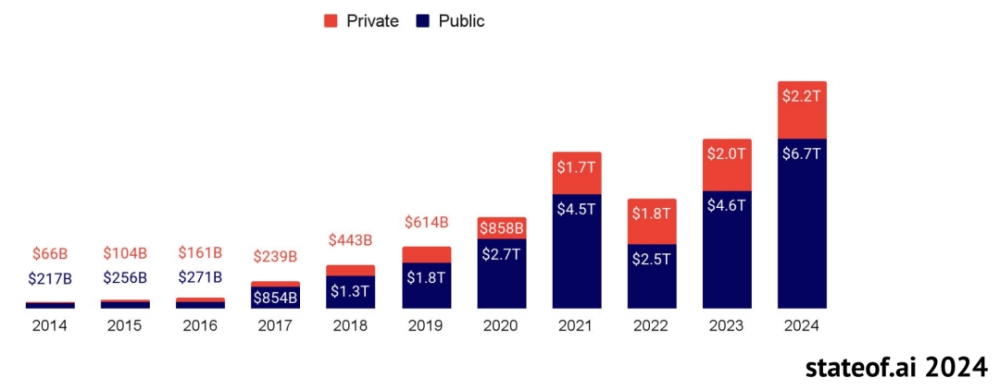 仅上市公司的企业价值就已超过2023年整个市场的价值。
