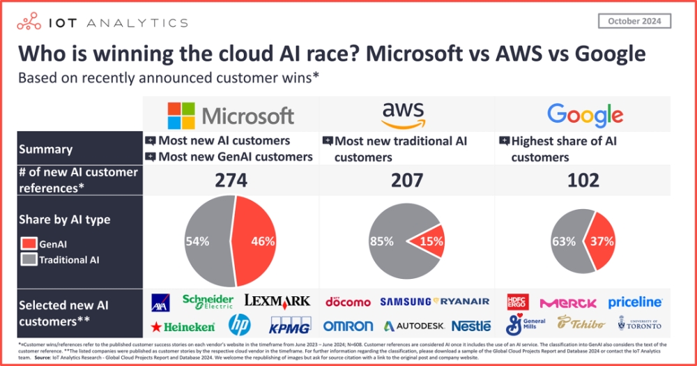 AWS以207个案例(34%)位列第二,电子行业巨头三星和食品饮料巨头雀巢是其新增的明星AI客户。