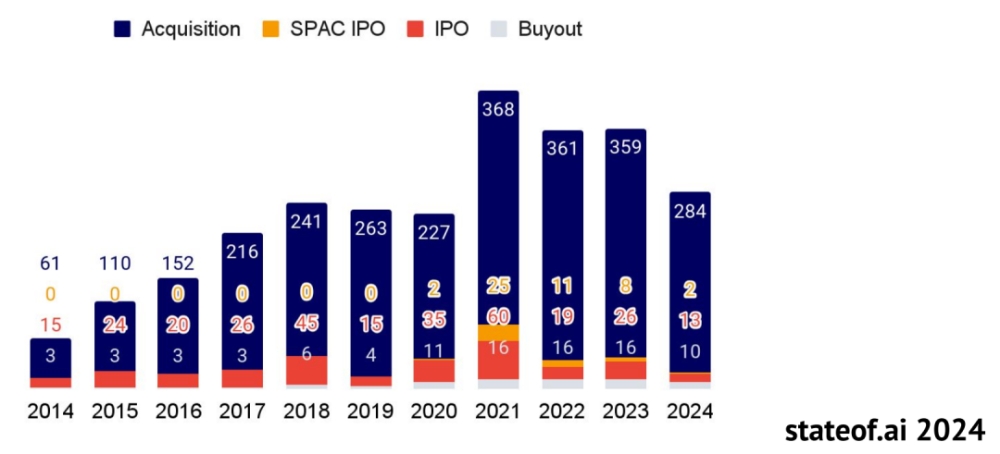 1. 人工智能公司的总市值已达9万亿美元。尽管生成式AI大获成功,对AI初创企业的投资有所增加,但总体融资规模却有所下降。 2. 少数头部AI公司开始实现可观收入,这其中既包括AI基础模型的开发者,也包括专注视频、音频生成等细分领域的初创企业。然而,随着AI模型成本的持续走低,如何实现长期可持续盈利仍是一大难题。3. 并购已成为部分难以找到可行商业模式的人工智能公司的重要出路。
