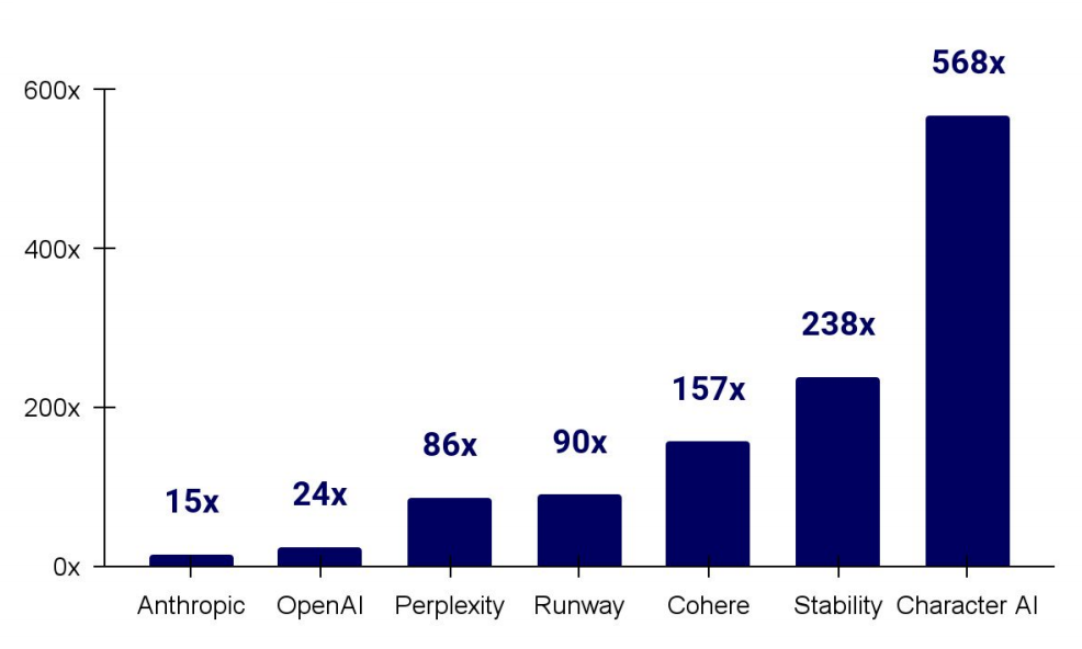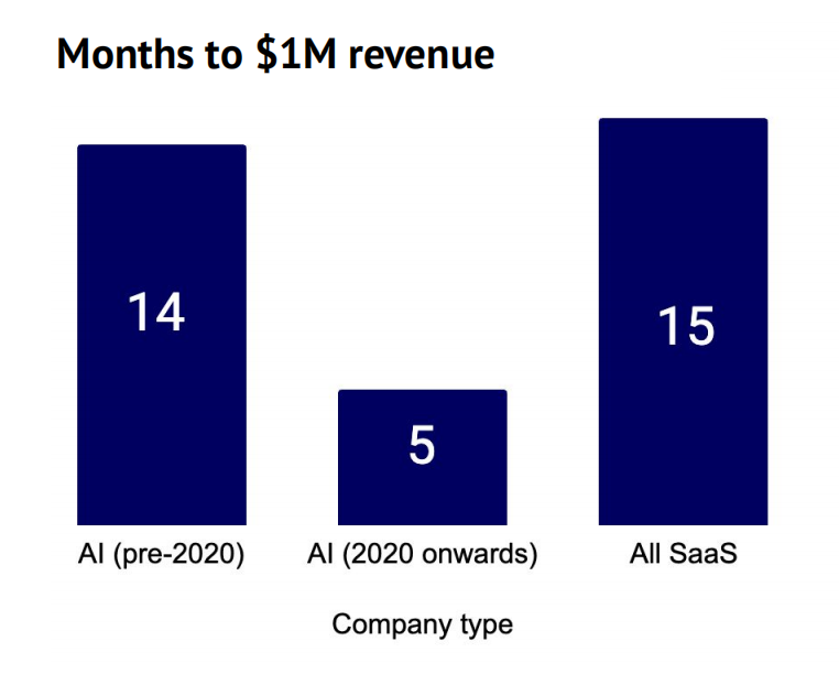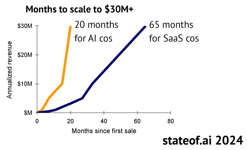 值得注意的是,达到3000万美元以上年收入的AI公司平均只用了20个月,而同等有前景的SaaS公司则需要65个月。