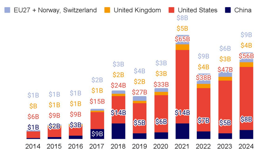 AI投资在各个地区飙升,在xAI和OpenAI等公司60亿美元融资的推动下,美国私募市场继续保持领先,对AI公司的总投资接近1000亿美元。