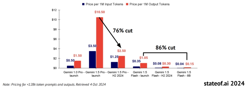 谷歌的Gemini系列以极具竞争力的价格推出了性能卓越的模型。Gemini 1.5 Pro和1.5 Flash在发布几个月后,价格就下降了64~86%,同时仍保持强劲的性能表现。例如,Flash-8B的价格比1.5 Flash低50%,但在许多基准测试中表现相当。