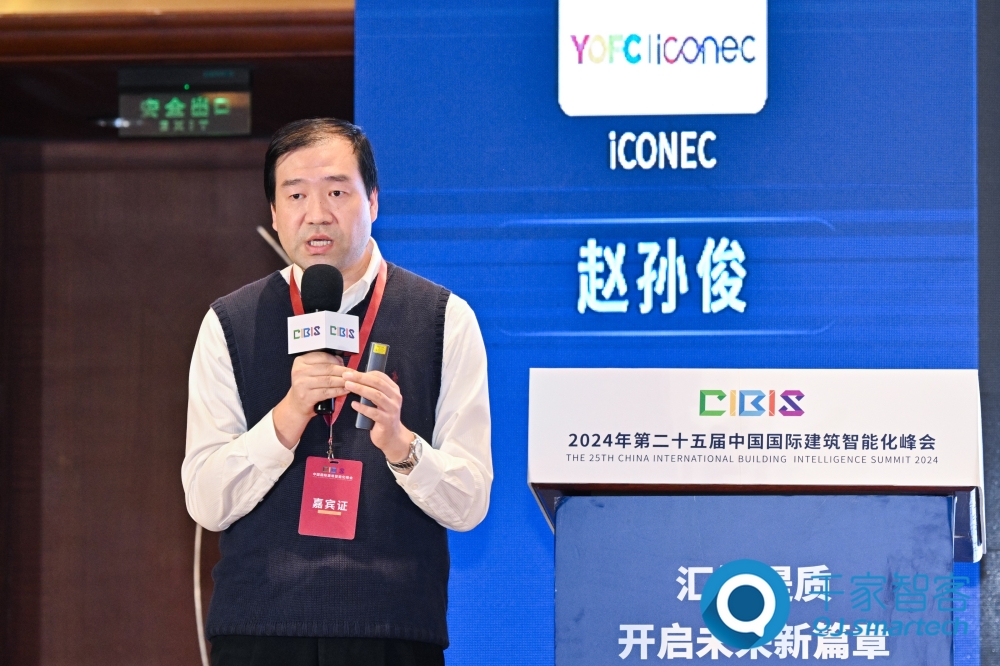 接着,上海现代设计集团教授级高工赵济安带来了《数智建筑行业高质量发展新导向、新动能、新进发》的主题分享。赵济安从后信息时代的技术浪潮出发,分析了数智建筑行业的高质量发展方向。他指出,云计算、大数据、人工智能等技术驱动全系统变革,推动万物互联和生态重塑。在这一过程中,智能建筑行业需正视数字技术供需失衡的现实,坚持“可推、可用、可持续”的发展原则,以精准把握技术应用的适用性和实际价值,从而实现高效变革和持续优化。