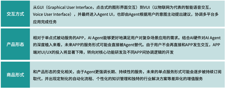 Agent作为融合感知、分析、决策和执⾏能⼒的智能体,能够根据⽤户历史⾏为和偏好,主动提供建议、提醒并个性化执⾏能⼒,为⽤户提供⾼度个性化的任务。其交互的主动性和⾃动化远超现有工具。