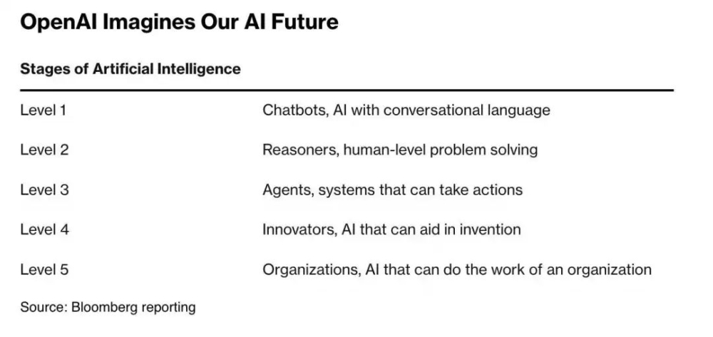 根据彭博社的描述,OpenAI将AI的能力分为5个阶段:聊天机器人、推理者、智能代理、创新者和组织建设者。
