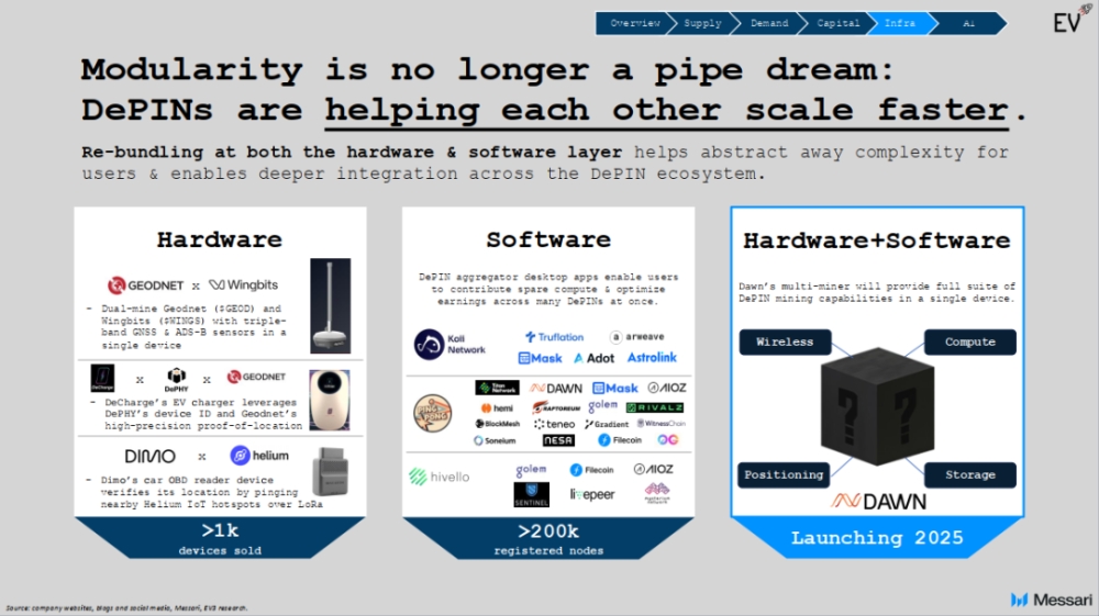 这份104页的年度报告,以前瞻性的视角展望了2025年DePIN的趋势走向。DePIN与人工智能AI的融合、分布式无线网络DeWi、分布式能源网络DeGEN、算力网络、传感器网络等前沿领域均被纳入分析视阈。