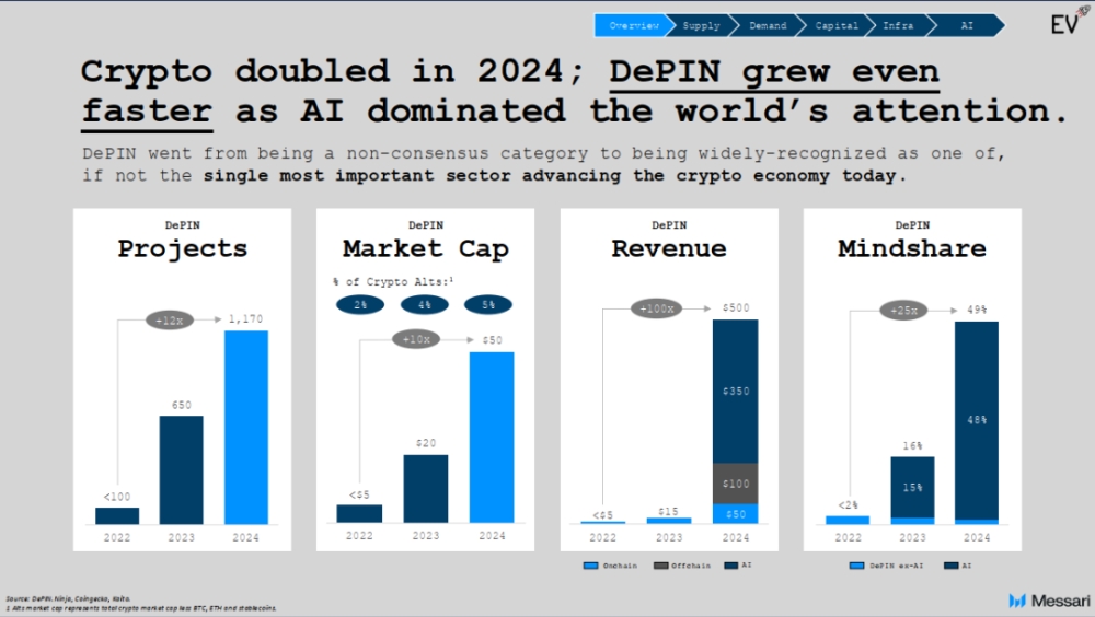 具体而言,DePIN项目数量增长了12倍,达到1170个;市值增长10倍,达到500亿美元;营收增长了100倍,达到5亿美元;心智份额增长了25倍,达到49%。